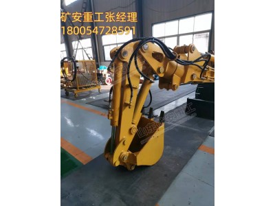 巷道修复机工作装置部分根据实际修复需要,可将挖斗、铣挖头、破碎锤等专用属具通过液压快换装置实现快速互换。利用挖斗挖装煤岩,转载到刮板运输机、皮带运输机、矿车或其他装载设备上,同时工作臂能左右旋转±180°,对巷道侧帮、顶板等进行修护作业;液压破碎锤能破碎巷道内较硬岩石、混凝土;铣挖切割头能开挖水沟或巷道周边铣槽。