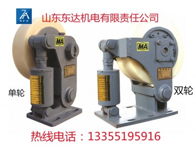 运转中由于滚轮的胶层被磨损,通过调节螺杆调节滚轮使滚轮前倾靠近罐道。调节螺杆一端为左旋螺纹另一端为右旋螺纹,分别拧入调节套和碟簧轴,调整时松开调节螺杆下边的螺母,逆时针转动调节螺杆,螺杆拧出,滚轮前倾靠近罐道,调好后紧固调节累杆下边的螺母。